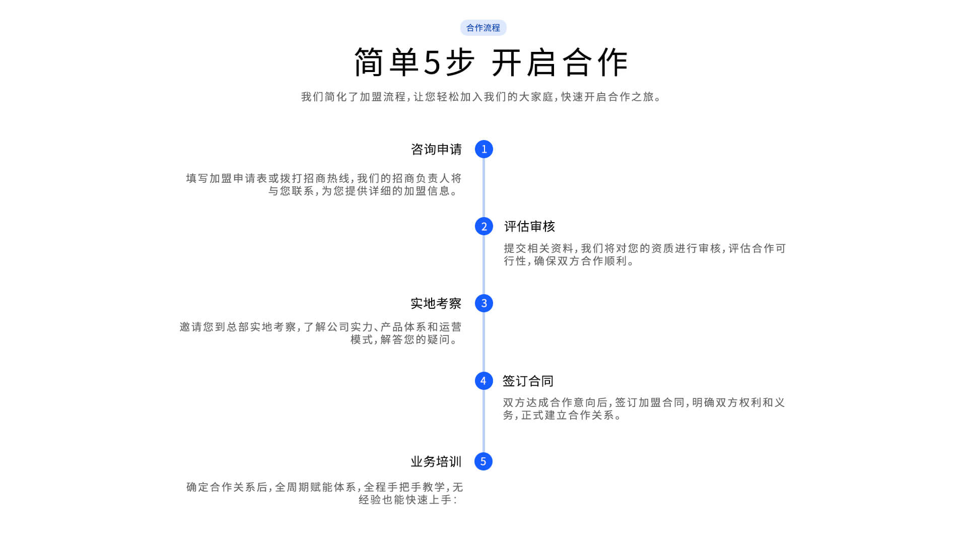 我们简化了加盟流程,让您轻松加入我们的大家庭,快速开启合作之旅。
